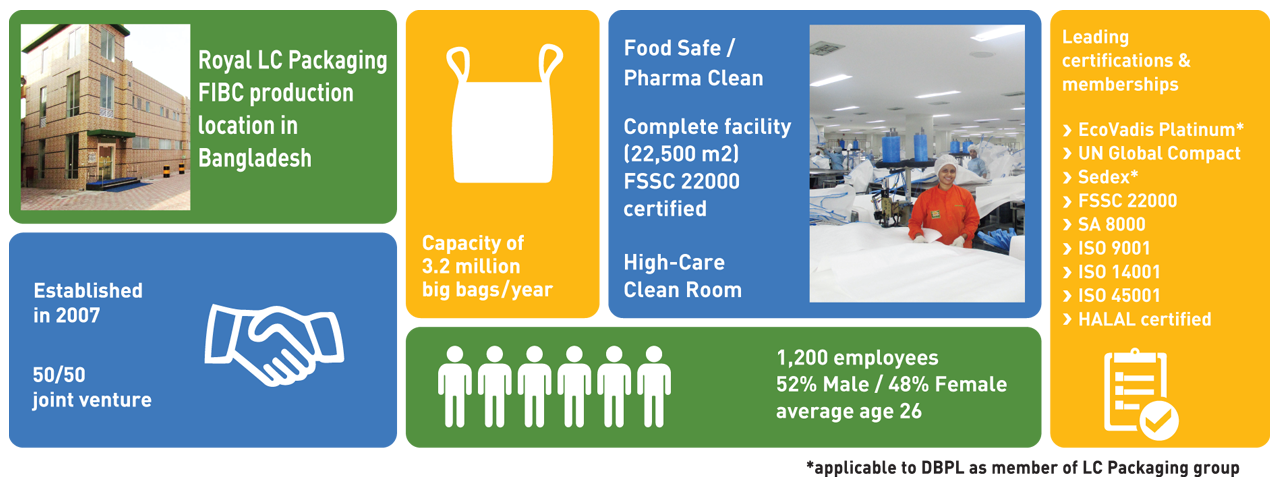 To emphasize the commitment of DBPL towards quality, efficiency and responsible and sustainable business practices, the company has achieved the ISO 9001, ISO 14001, ISO 45001, FSSC 22000 and SA 8000 certification standards. With the accomplishment of the aforementioned certificates, DBPL is the first and only FIBC manufacturer in the world to have achieved these certificates in unison.